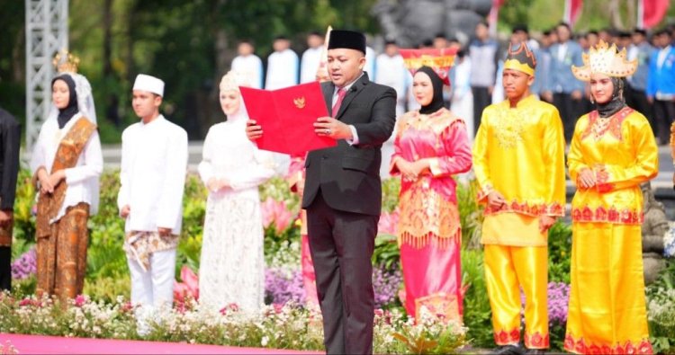 PASURUAN - Peringatan Hari Sumpah Pemuda ke-97 tahun ini terasa begitu istimewa, berlatar belakang keindahan Gunung Penanggungan yang memukau. Amphitheater Taman Candra Wilwatikta, Pandaan, menjadi saksi bisu khidmatnya upacara bendera yang kali ini dipimpin langsung oleh Gubernur Jawa Timur, Khofifah Indar Parawansa. Sebuah kehormatan tersendiri bagi Bupati Pasuruan, Rusdi Sutejo, dipercaya untuk membacakan Teks Keputusan Kongres Pemuda Indonesia 1928, sebuah momen yang menggugah semangat persatuan.